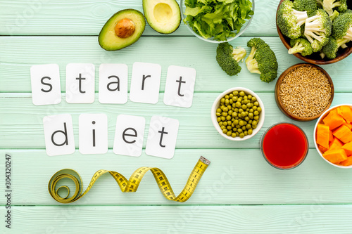 Start Diet Text Near Healthy Food On Green Wooden Background Top